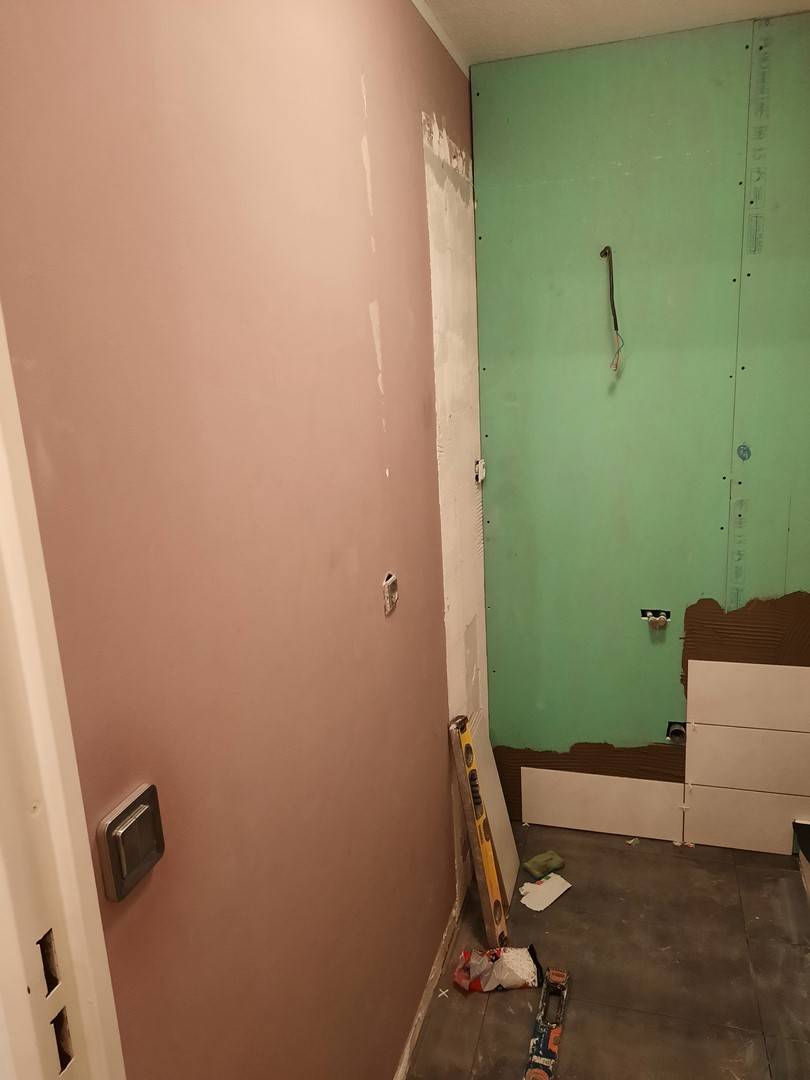 Les murs ont été repris en plaques de plâtre avec réalisation des bandes et joints. La plomberie et l’électricité ont été adaptées à la nouvelle configuration.